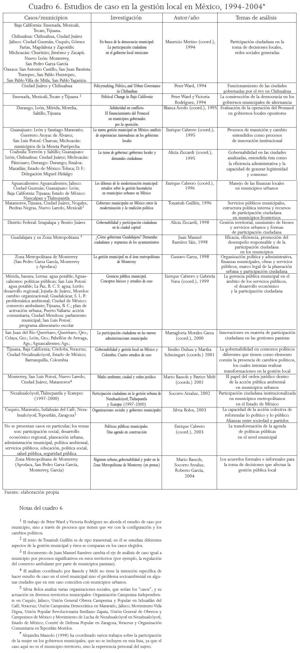 7 Todos los trabajos que aquí se mencionan se presentan en un cuadro anexo; sólo abordamos investigaciones ya publicadas y una que está en proceso. La clasificación que presentamos se basa en el estudio de Enrique Cabrero (1999).