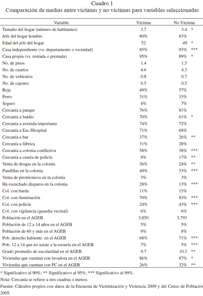 Para el análisis descriptivo se realizaron pruebas de diferencia de medias entre las características de los hogares víctimas y no víctimas de robo a casa habitación, las cuales están contenidas en el Cuadro 1.13