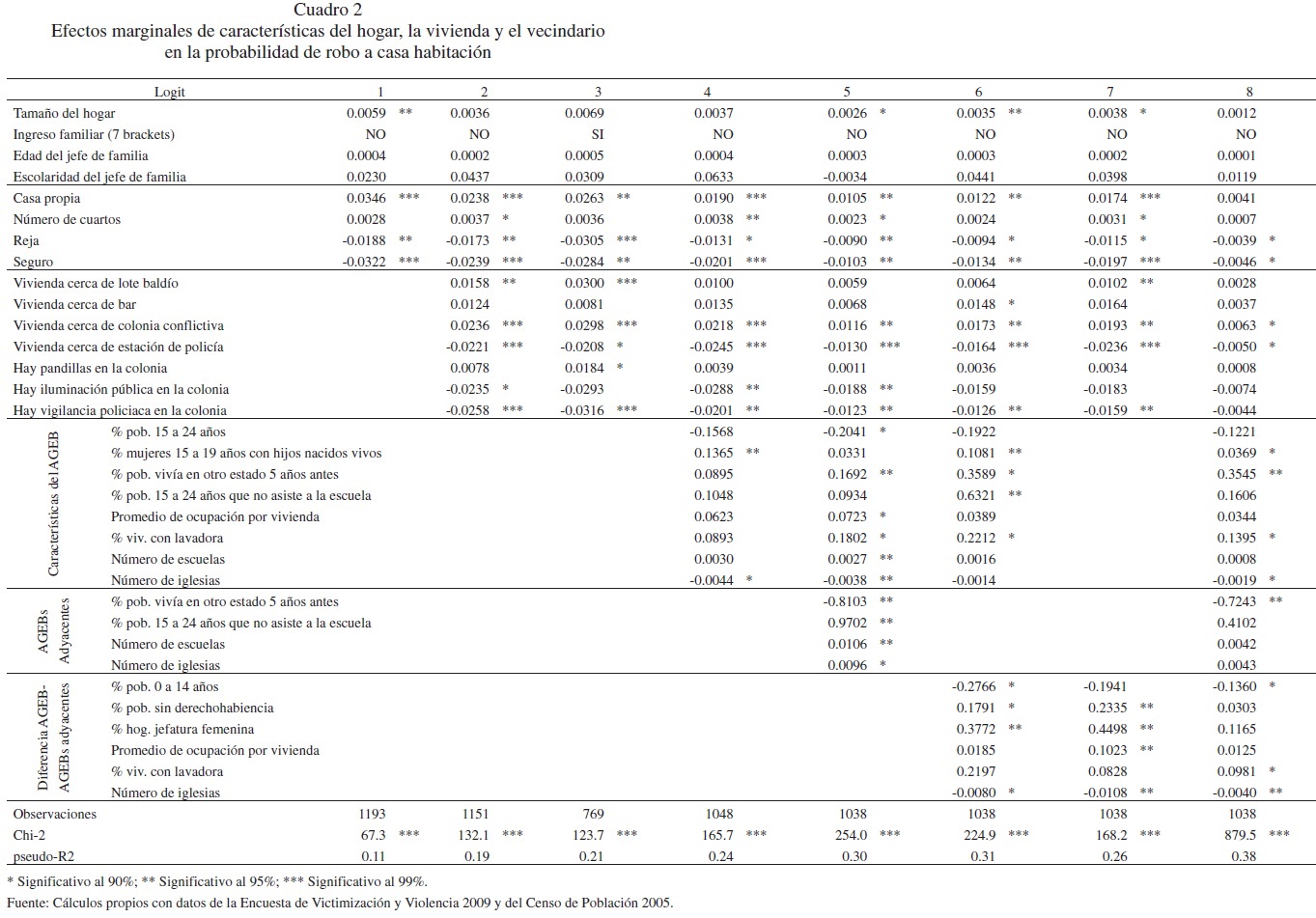 Para estimar el efecto de las características del hogar, la vivienda, el vecindario y los vecindarios adyacentes sobre la probabilidad de que un hogar sea víctima de robo se corrieron regresiones logísticas con diferentes especificaciones. El Cuadro 2 presenta los resultados de ocho especificaciones seleccionadas.