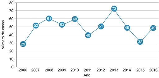 Figura 1: Frecuencia de cáncer de mama en el Hospital Ángeles Mocel en el periodo 2006-2016.
