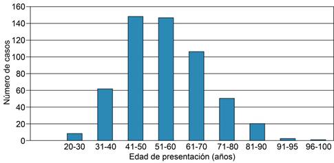 La edad promedio al momento del diagnóstico en nuestro estudio demostró que fue de 55 años, siendo el grupo más afectado el de 41-50 años, seguido por el de 51-60 años, contrario a los países desarrollados (Europa y Estados Unidos), donde la edad promedio se ha registrado a los 63 años.15