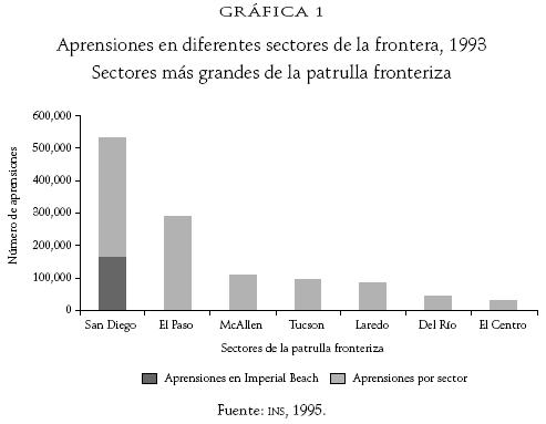 Un año después de la entrada en vigor del operativo en El Paso, en 1994 se puso en marcha la Operación Guardián en el área de San DiegoTijuana, que era la zona con mayor tránsito de migrantes indocumentados (Ver gráfica 1). El resultado fue nuevamente vistoso y exitoso en cuanto al decrecimiento significativo del número de aprensiones. Los migrantes tuvieron que abandonar su punto de reunión, llamado el soccer field y su ruta del Cañón Zapata y se movieron al <<Bordo>>, pegado a la carretera que va a la playa. Luego se construyeron bardas y finalmente se amuralló toda el área vecina de Tijuana, incluyendo parte de la zona marítima. Los migrantes se tuvieron que dirigir hacia otras zonas y allí se incrementó el número de aprensiones.