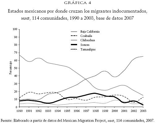 De acuerdo con los datos del MMP, el paso por el estado de Baja California, colindante con California dejó de ser el principal lugar de cruce de migrantes indocumentados en el año 1996 y el estado de Sonora empezó a cobrar inusitada importancia a partir de 1993. Ambos estados concentran al 70% de la población indocumentada que cruza por esa zona. Por su parte, los otros estados fronterizos: Chihuahua, Coahuila y Tamaulipas mantienen una tendencia constante, cercana al 10%. Otras fuentes, confirman estas mismas tendencias (Eschbach et al., 1999, 2001; GAO, 2006).