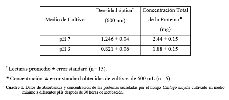 Método: Se generaron las formas de micelio o levadura de Ustilago maydis (cepa FB2a2b2) a través del cultivo en medios mínimos con pH 3 y 7 respectivamente y se determinó su cinética de crecimiento. Las proteínas secretadas al medio se concentraron en una columna de fase reversa Sep-Pak Plus C18 y se eluyeron con una solución de acetonitrilo (60 %) + ácido trifluoroacético (0.1 %), seguida de su liofilización parcial, y precipitación con ácido tricloroacético-acetona. Posteriormente las muestras fueron sometidas a electroforesis en poliacrilamida (SDS-PAGE) y los geles teñidos con azul de Coomassie. Las bandas de proteína se cortaron del gel y se digirieron con tripsina. Las mezclas de péptidos fueron inyectados para su análisis en un espectrómetro de masas y el espectro MS/MS obtenido fue procesado en Masslynx 4.0 antes de someterlo al programa MASCOT (Matrix Science) para realizar las búsquedas no-redundantes en la base de datos del National Center for Biotechnology Information.