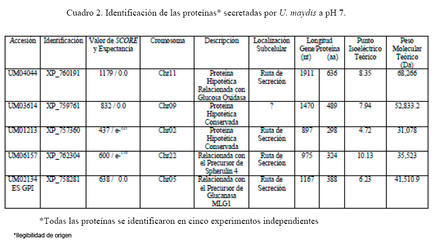 Resultados: El crecimiento de U. maydis a pH 7 fue mayor que a pH 3 (D.O. a 600 nm= 1.35 y 0.85, respectivamente) a las 30 h de incubación. El proceso dimórfico de levadura a micelio a pH 3 se inició a las 8 h después de iniciados los cultivos. A las 30 h de cultivo se observó que el 100 % de las células tenían una morfología micelial. A este tiempo, se colectó el sobrenadante y se sometió al proceso descrito anteriormente, obteniéndose de manera reproducible 8 bandas de proteína del medio mínimo del cultivo a pH 7 y 2 del medio mínimo del cultivo de pH 3. Las proteínas se analizaron, pero solo fue posible identificar 5, todas ellas provenientes del medio de pH 7, cuyas masas teóricas oscilan entre 31 y 68 kDa y presentan valores de punto isoeléctrico calculados en un rango de 4.72 a 10.13. Cuatro de las 5 proteínas fueron identificadas como de secreción de U. maydis. Tres de las 5 proteínas son de función desconocida, una está relacionada con el precursor de la spherulin 4 y la última parece ser una proteína GPI (glycosyl phophotidylinositol ) relacionada con una glucanasa.