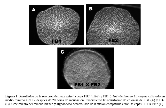 Para este fin se llevaron a cabo experimentos de apareamiento y confirmar el fenotipo "Fuzz" empleando cepas de genotipo conocido que incluyeron esporidias de FB2 (a2b2) y su contraparte compatible FB1 (a1b1). La prueba consiste en mezclar alícuotas de suspensiones celulares de las dos cepas, inocularlas juntas en placas con medio de cultivo mínimo o completo para U. maydis adicionado de 1% de carbón activado. Las placas se incuban a 28 °C por un tiempo de 10 a 18 horas (Martínez-Espinoza et al., 1997).