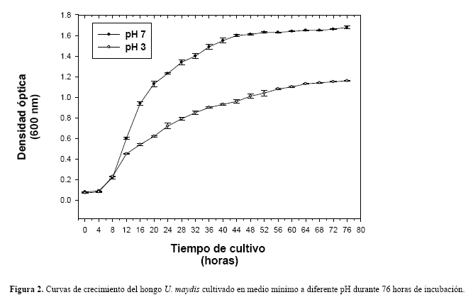 Es importante hacer notar que en este estudio se logró reproducir las condiciones necesarias para inducir el proceso dimórfico de U. maydis cultivado bajo condiciones in vitro a diferentes pHs. Las observaciones realizadas en los cultivos experimentales señalan que la inducción del crecimiento micelial se inicia a las 8 h después de la inoculación en medio de pH 3, lo cual coincide con datos obtenidos previamente (Ruíz-Herrera et al., 1995) y se completa antes de las 24 h de incubación.