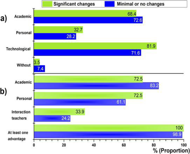 In general, comparing groups according to their perceptions in the changes of the dynamic of the courses, no statistical differences were found when students reported advantages or disadvantages, in fact, almost every student reported at least one improvement in their academic or personal field as well as in a better communication with their teachers during the transition from academic activities to a completely remote modality (Fig. 1). Among which, the most important were those related to their academic performance reflected in better grades, a perceived integral learning (application of knowledge addressed in several course) and an improvement in the use of technological tools. In contrast to only 3.5-7.4% of the population who suggested not having any problems during this contingency, while the most common ones where related to technology education besides the limited access and availability to technological tools.