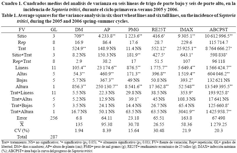 La información de los cuatro experimentos se combinó y se analizó en SAS para identificar los efectos entre sitios, tratamientos (con y sin competencia) y sus interacciones SAS (1999). Las diferencias entre altura y tratamientos, se determinaron utilizando la diferencia mínima significativa (DMS). El área bajo la curva del progreso de Septoria tritici se calculó con la ecuación propuesta por Roelfs et al. (1992).