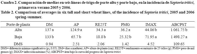 En diferentes investigaciones se reportan variables asociadas con el ataque de S. tritici en trigo, por ejemplo: DM y AP (Arraiano et al., 2006), PMG (Simón et al., 2002; Leyva et al., 2006), ABCPST (Simón et al., 2005; Leyva et al., 2006). En el presente trabajo estas variables también se asociaron con mayor resistencia a la enfermedad, aunque de acuerdo con Brown et al. (2001), el porcentaje de infección en campo (IMAX) se puede considerar como buen criterio para evaluación de resistencia.