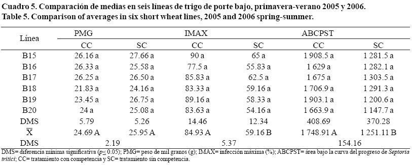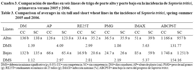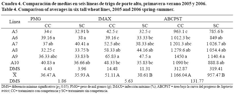 El PMG promedio con competencia, en las líneas altas (36.4 g) fue superior a las líneas bajas (24.6 g), que indica su potencial de rendimiento. El ABCPST y la infección máxima, tanto para el grupo de las líneas altas como para las bajas, los valores promedio entre medias de tratamientos CC y SC fueron estadísticamente diferentes (Cuadros 4 y 5); resultando que ambas alturas cuando la planta estuvo bajo competencia se incrementó presencia de la enfermedad.