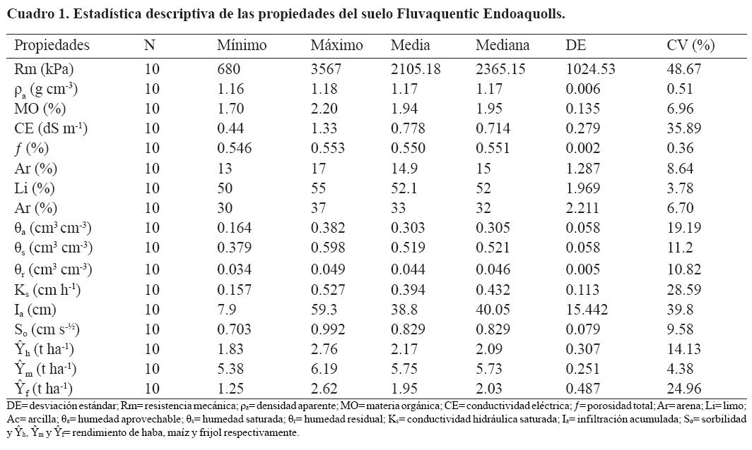 Las propiedades del suelo que presentaron coeficientes de variación (CV), mayores de 25% fueron la Rm, Ia, CE y Ks. Lo que indicó una mayor variación espacial de estos en el área donde se ubicaron las parcelas. Los coeficiente de variación de las variables físicas: θa, θs, θr, So, Ar, Lm y Ac, fueron menores de 20%; pero la ρa y ƒ fueron cercanos a cero o con una distribución espacial uniforme. Para el rendimiento de grano del haba (Ŷh), maíz (Ŷm,) y frijol (Ŷf), los coeficientes fueron de bajos a moderados, con un rango de 4.38 a 24.96%. Otras estadísticas tales como: mínimo, máximo, media, mediana y la desviación estándar se muestran en el (Cuadro 1).