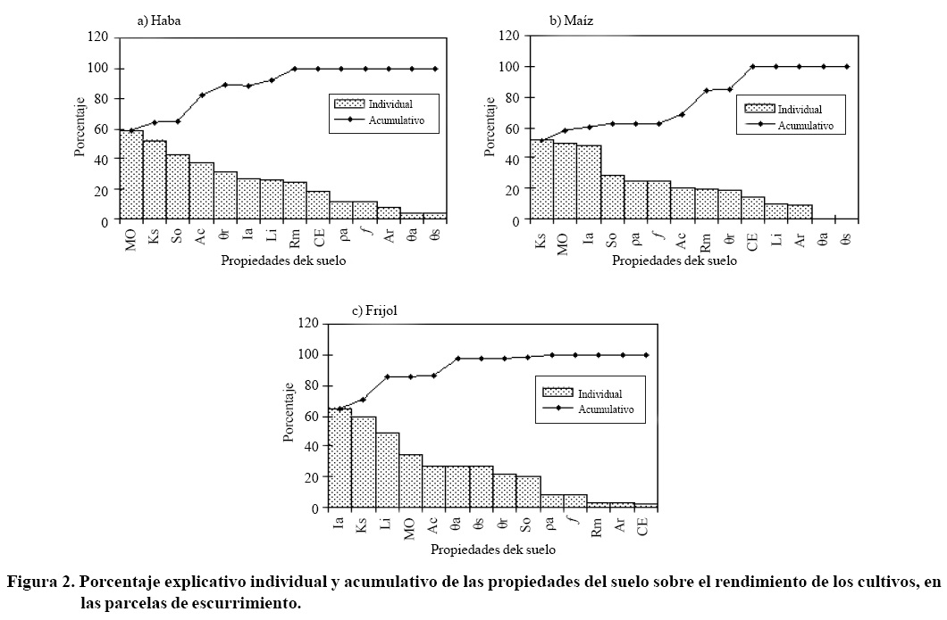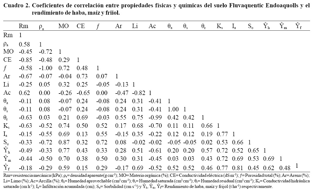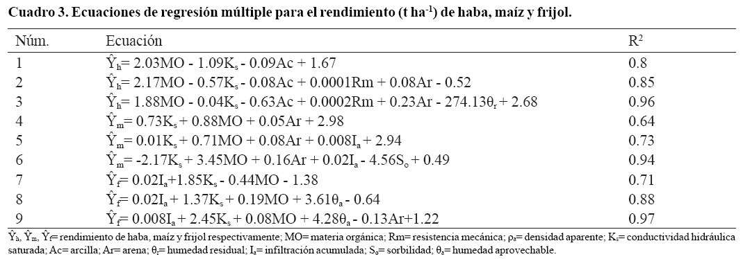 Con la inclusión de dos o más propiedades del suelo como variables independientes y el rendimiento de grano del haba, maíz y frijol como variable dependiente en las regresiones múltiples la R2 mejoró de 0.64 a 0.97. La MO, Ks y Ac, explicaron 80% el rendimiento de haba, pero al incluir Rm y Ar se explicó 85% y al incluir la θr se alcanzó 96% (Cuadro 3).