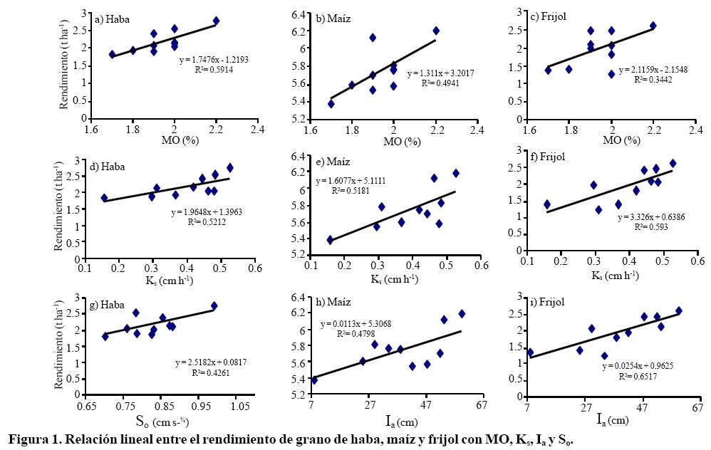 Al efectuar las regresiones lineales simples, la MO, Ks, Ia y So tuvieron una regresión lineal aceptable con el rendimiento de los tres cultivos. En la Figura 1 se ilustran que la MO y Ks se relacionaron con el rendimiento de haba, maíz y frijol (R2< 0.60; Figura 1a-f); So con el rendimiento de haba (R2= 0.42; Figura 1g); mientras que la Ia se relacionó con el rendimiento de maíz y frijol (R2< 0.66; Figura 1i-j).