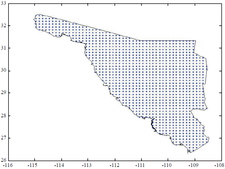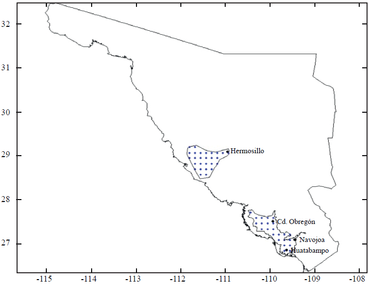 En total para Sonora se descargaron los datos de 1 076 nodos, los cuales se muestran en la Figura 1. Se identificaron 27 nodos que cubren la Costa de Hermosillo y 24 nodos para cubrir la región agrícola Sur de Sonora (Figura 2). Con estas temperaturas promedio mensuales y mediante la técnica de cuadrados mínimos se obtuvieron modelos de regresión entre los datos de las estaciones de la red Agroson y los datos de los nodos. Se utilizaron todos los datos disponibles para cada estación y los correspondientes en los nodos durante el período 2000-2010. Los modelos de regresión permitieron obtener los parámetros estadísticos para calcular las temperaturas diarias de los nodos en el año 2020 y 2050, bajo la suposición de que la oscilación térmica se mantendrá. Esta suposición se vuelve primordial toda vez que para calcular la humedad relativa (HR) horaria se hizo una regresión entre los datos de temperatura y HR, a diferentes desfases. Los desfases elegidos fueron aquellos donde se encontró la máxima correlación positiva.