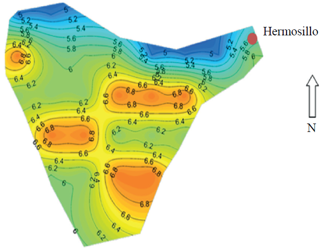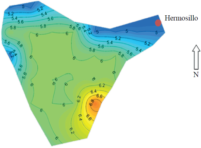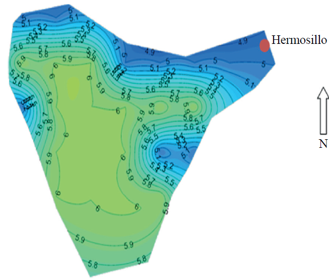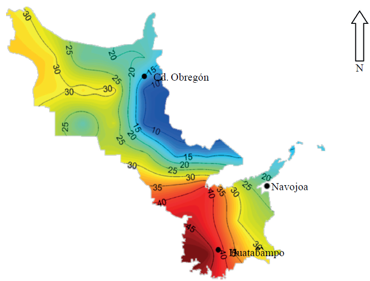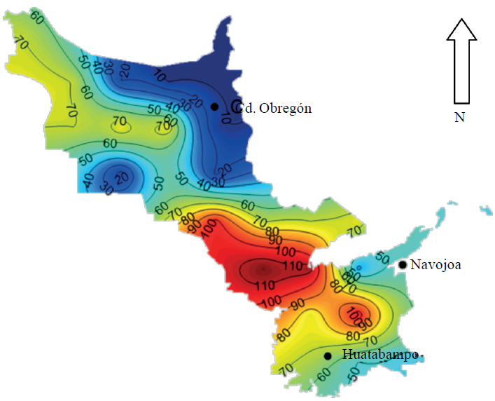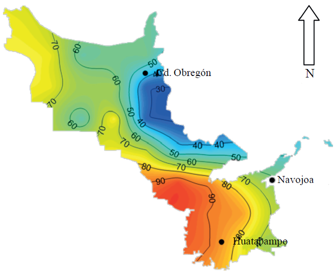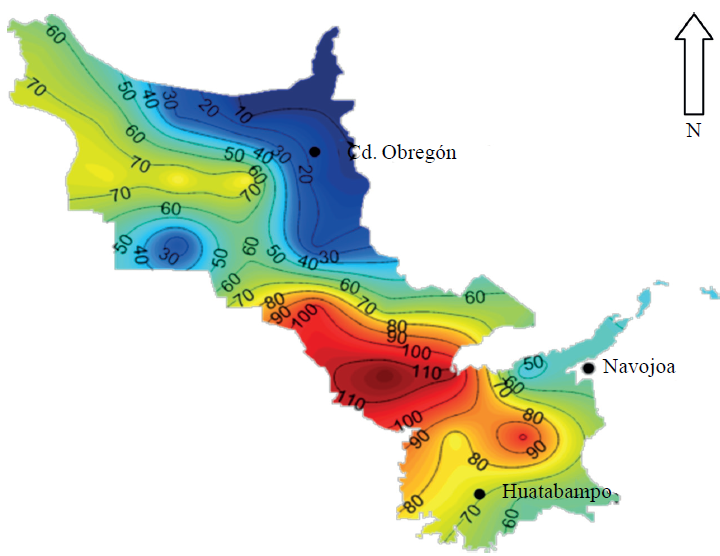De acuerdo a los resultados obtenidos en cuanto a los días de condiciones favorables para la infección por ésta enfermedad, puede observarse que de acuerdo las gráficas con isolíneas que se muestra en la Figura 6, que se refiere a la situación reciente (2010), estos oscilan entre 30 y 90 días, siendo menores en las áreas trigueras del norte más cercanas a la zona urbana de Ciudad Obregón, mientras que los mayores riesgos se presentan en la zona costera especialmente hacia el Valle del Mayo, sobre lo cual influyen mucho las corrientes húmedas del mar, además de que son partes bajas que presentan mejores condiciones de bajas temperaturas que favorecen el desarrollo del hongo. También es claro, que la región del Valle del Mayo en general presenta mejores condiciones favorables para la enfermedad, y es muy común que en ésta área se inicien las infecciones para el área Sur de Sonora.