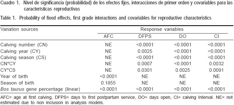 La EPP, DPS, DA y el IEP se analizaron con el procedimiento Mixed de SAS(5); el modelo para EPP incluyó los efectos fijos del año de nacimiento de las vacas, el efecto fijo de la época de nacimiento, la interacción de año de nacimiento x época de nacimiento, y el efecto racial lineal de porcentaje de genes BT; mientras que el modelo para DPS, DA e IEP incluyeron los efectos fijos de año de parto de la vaca, estación de parto, número de parto, los efectos aleatorios de semental y de vaca anidada en semental, y el efecto racial lineal de porcentaje de genes como covariable.