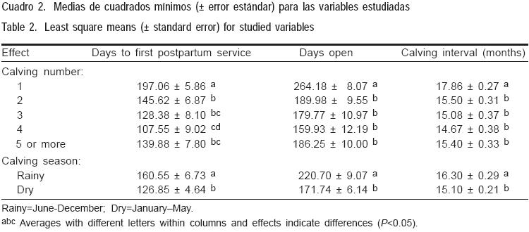 El nivel de significancia de los efectos principales, las interacciones de primer orden y las covariables de las características reproductivas se presentan en el Cuadro 1; mientras que las medias de cuadrados mínimos de días al primer servicio (DPS), días abiertos (DA) e intervalos entre partos (IEP) se muestran en el Cuadro 2. El número de parto influyó significativamente (P<0.05) en DPS, DA e IEP. Las vacas de cuarto parto tuvieron valores inferiores de DPS con respecto a las de segundo y tercer parto; éstas a su vez fueron diferentes a las de primer parto. De forma similar las vacas de segundo o más partos presentaron DA e IEP más cortos (P<0.05) con respecto a las de primer parto. La diferencia en la reducción de días al primer servicio se explica por el crecimiento y desarrollo corporal de las vacas adultas con respecto a las jóvenes. Estos resultados coinciden con los observados por otros autores(6,7) en animales de distintos ambientes tropicales.