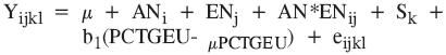 Donde: Yijkl es una observación de la variable respuesta (EPP); μ es la media general; ANi es el efecto fijo del iésimo año de nacimiento de la vaca (i=1990, 1991,..., 2000); ENj es el efecto fijo de la jésima estación de nacimiento de la vaca (j=lluvias, seca); AN*ENij es el efecto fijo de la interacción de año de nacimiento con estación de nacimiento de la vaca; Sk es el efecto aleatorio del késimo semental (k=1,..., 116); PCTGEU es el efecto racial lineal de porcentaje de genes de razas europeas como covariable; b1 es el coeficiente de regresión lineal asociado con el porcentaje de genes de razas europeas; μ PCTGEU es la media estimada de la covariable racial lineal porcentaje de genes de razas europeas; y eijkl es el error aleatorio.