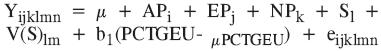 Donde: Y ijklmn es una observación de la variable respuesta; μ es la media general; APi es el efecto fijo del iésimo año de parto de la vaca (i=de 1994, 1995,..., 2001); EPj es el efecto fijo de la jésima estación de parto de la vaca (j=lluvias, seca); NPk es el efecto fijo del késimo número de parto de la vaca (k=1, 2,..., 5+); Sl es el efecto aleatorio del lésimo semental (l=1,...,97); V(S)lm es el efecto aleatorio de la mésima vaca anidada en el lésimo semental; PCTGEU es el porcentaje de genes de razas europeas como covariable; b1 es el coeficiente de regresión lineal asociado con el porcentaje de genes de razas europeas; μ PCTGEU es la media estimada de la covariable porcentaje de genes de razas europeas; y eijklmn es el error aleatorio.