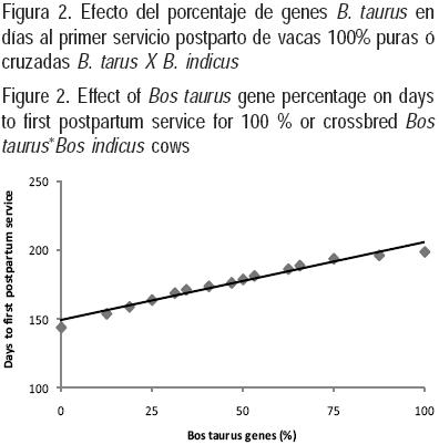 Algunos estudios(8,9,10) sugieren que el grupo racial de la vaca influye positivamente en la actividad reproductiva de los animales provenientes de los cruzamientos de BI X BT. En el presente estudio se observó que la covariable proporción de genes BT influyó (P<0.05) la EPP, los DPS, DA e IEP en los animales BI.
