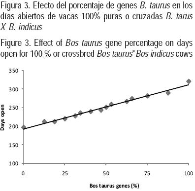 Como se observa en las Figuras 2 y 3, los DPS y DA tuvieron comportamientos similares. Los valores más bajos (P<0.05; R2 = 0.74) de 148 y 196 días para DPS y DA, respectivamente, fueron observados en los animales 100 % BI. Posteriormente, conforme se incorporan genes BT en cruzamientos con las hembras BI, ambas variables incrementan linealmente hasta alcanzar valores máximos de 224 y 320 días para DPS y DA, respectivamente, que corresponden a los genotipos con 100 % de BT. Lo anterior sugiere que las vacas 100 % BI tienen características reproductivas mejores cuando se comparan con vacas cruzadas con cualquier proporción de genes europeos. Los resultados obtenidos en el presente estudio coinciden con los de otras investigaciones(10,14) en donde se afirmó que los DA incrementan hasta 100 % conforme la inclusión de genes europeos incrementó en las cruzas con razas cebuinas.
