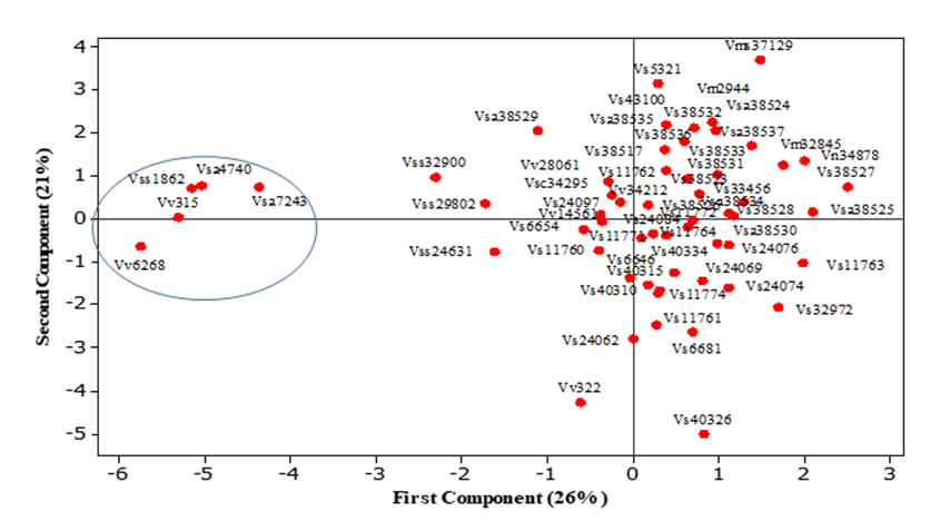 In PCA, since the first component includes changes that are not explained by the second component and the two components are independent of each other, so the two components were intersected vertically and in the form of a biplot diagram to determine the diversity between different genotypes and determine the far and near genotypes to be used. Phenology traits (day to sprout, days to first flowering, days to total flowering, days to maturity) accounted for the variations recorded in the populations in PC1. On the other hand, yield traits (biomass yield and dry weight) accounted for the variation observed in the populations in PC2. The total cumulative variance in the first two PC was more than 46 %, indicating the high degree of diversity among the traits under study. Furthermore, the traits can be used as phenotypic traits in differentiating the populations. In plot PCA (Figure 1), populations, V. sativa var.angustifollia (Vsa7243, Vsa4740), V. sativa var.sativa (1862) and V. villosa (Vv315, Vv6268), separated from other populations and located on the left of X-axis by containing less of phenology traits (important in the first component). So, these populations recommend for areas with short growth periods. Populations V. sativa (40326) and V. villosa (322), for containing high value of biomass and dry weight, located on the bottom of Y-axis (negative effect of biomass and dry weight on the second component). As a result, two populations, V. sativa (40326) and V. villosa (322), produce forage yield more than other populations.