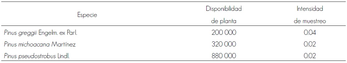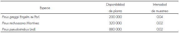Las especies evaluadas fueron P. greggii, P. michoacana y P. pseudostrobus, producidas en charolas de poliestireno de 77 cavidades con volumen cada una de 170 cm3. Para determinar la calidad de la planta se consideraron sus existencias en el vivero (Cuadro 1), por lo que se hizo la selección con una intensidad de muestreo promedio de 0.027 % en un intervalo de 0.04 a 0.02 %. Los ejemplares se evaluaron con el ciclo 2008 de producción anual a una edad de 9 meses.