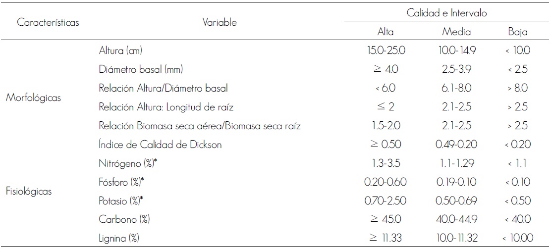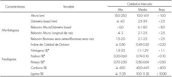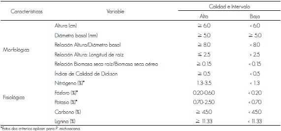 La clasificación de calidad de planta se realiza con base en variables morfológicas y fisiológicas; entre las primeras se incluye la altura, el diámetro basal del tallo o del collar, tamaño, forma y volumen del sistema radical, así como la relación altura/diámetro del collar, la relación tallo/raíz, la presencia de yema terminal y micorrizas, el color del follaje y la sanidad, el peso seco de los tallos, el follaje y la raíz. En los atributos fisiológicos se consideran: resistencia al frío, días para que la yema principal inicie su crecimiento, índice de mitosis, potencial hídrico, contenido nutricional y de carbohidratos, tolerancia a sequía, fotosíntesis neta, micorrización y capacidad de emisión de nuevas raíces (Prieto et al., 2003; Prieto et al., 2009).