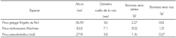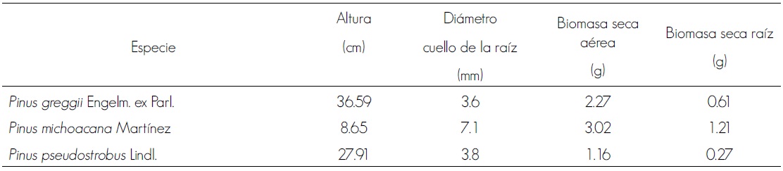 Los valores registrados en altura fluctuaron de 8.65 cm en P. michoacana hasta 36.59 cm en P. greggii y en diámetro del cuello de la raíz (diámetro basal) de 3.6 mm en P. greggii hasta 7.1 mm en P. michoacana (Cuadro 4). La mayor altura presentada en P. greggii se debe a que esta especie es de rápido crecimiento, en comparación con P. michoacana, que presentó valores promedio de tan solo 8.65 cm; asimismo, en diámetro de cuello de raíz se observaron diferencias entre P. greggii con tan solo 3.6 mm y P. michoacana que alcanzó los 7.1 mm, lo que puede explicarse porque las especies con crecimiento de hábito cespitoso tienen un mayor desarrollo inicial en diámetro y menor crecimiento en altura.