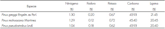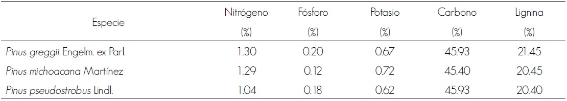 El contenido de nitrógeno varió entre 1.04 % en P. pseudostrobus y 1.30 % en P. greggii; en fósforo, entre 0.12 % en P. michoacana y 0.20 % en P. greggii; en potasio, varió entre 0.62 % en P. pseudostrobus y 0.72 % en P. michoacana. En carbono, fue de 45.40 % en P. michoacana y de 45.93 % tanto para P. greggii como para P. pseudostrobus. En lignina, en las especies últimas dos especies, los valores fueron de 21.45 % y 20.40 %, respectivamente, en tanto que en P. michoacana fue de 20.45 % (Cuadro 5).