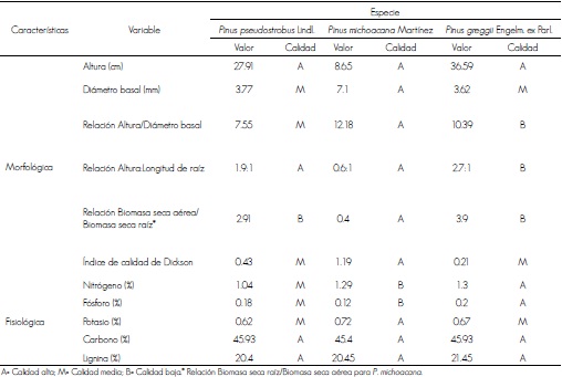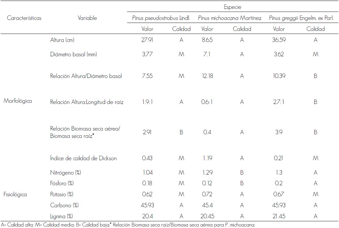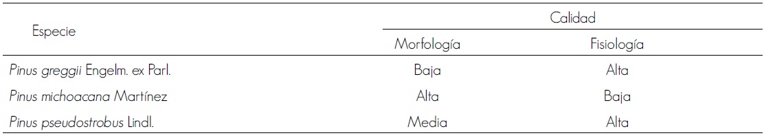 Con las características evaluadas, se determinó la calidad de planta al comparar los resultados con valores de diversos estudios realizados en coníferas, debido a que de especies mexicanas no se han calculado intervalos específicos, por lo que se definieron valores para especies de crecimiento normal y con hábito cespitoso (cuadros 2 y 3); para las primeras, se incluye la categoría de calidad media, para las cifras muy cercanas a los límites inferiores de los correspondientes a la calidad alta.