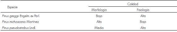Key words: Quality of plant, Michoacan, Pinus greggii Engelm. ex Parl., Pinus michoacana Martínez, Pinus pseudostrobus Lindl., forest nurseries.