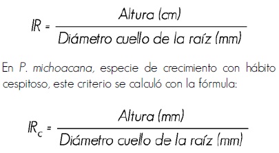 1. Relación altura/diámetro del cuello de la raíz o Índice de robustez (IR). Se estimó con la siguiente fórmula en las especies con crecimiento normal (P. greggii y P. pseudostrobus):