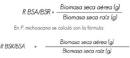 3. Relación biomasa seca aérea/biomasa seca raíz (RBSA/BSR). En P. greggii y P. pseudostrobus se calculó con la fórmula: