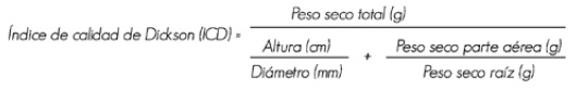 4. Índice de calidad de Dickson (ICD). Este índice permite evaluar mejor las diferencias morfológicas entre plantas de una muestra y se ha utilizado para predecir el comportamiento en campo de plántulas de Picea glauca (Moench) Voss y Pinus strobus L. (González et al., 1996). Este índice es el mejor parámetro para indicar la calidad de planta, ya que expresa el equilibrio de la distribución de la masa y la robustez, lo que evita seleccionar plantas desproporcionadas y descartar ejemplares de menor altura pero con mayor vigor (García, 2007).