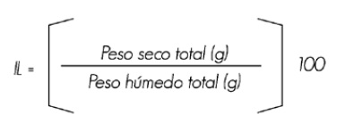 5. Índice de lignificación (IL). Relaciona el peso seco total con el peso húmedo total de la planta, que determina el porcentaje de lignificación y se calcula con la fórmula: