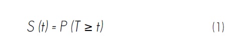 Donde S (t) es la probabillidad de que una muerte ocurra en un tiempo T al menos tan grande como el tiempo t (Kaplan y Meier, 1958); para ello, se tomó en cuenta el estatus de cada planta (viva o muerta) al final del periodo de evaluación, así como el tiempo de vida de la misma en meses. Este análisis se hizo con el procedimiento LIFETEST de SAS ver. 9.2 (SAS, 2009).