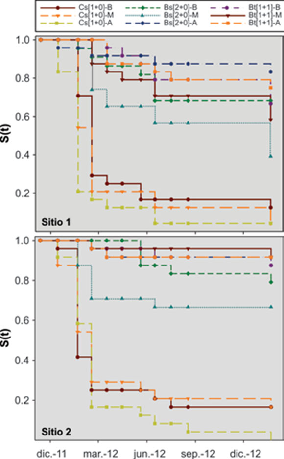 Figure 1. Estimated survival function [S(t)] for the different treatments evaluated for reforestation with Pinus pseudostrobus Lindl., in two plantation sites.