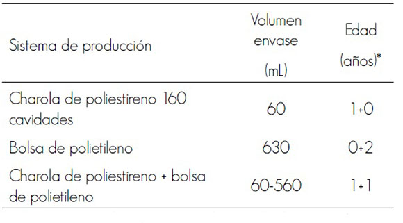 Se seleccionaron ejemplares de Pinus pseudostrobus cultivados en tres sistemas de producción (Cuadro 1) en el Vivero Forestal Bosque Escuela de la Facultad de Ciencias Forestales (UANL), ubicado en el ejido Santa Rosa, municipio Iturbide, Nuevo León, en las coordenadas 24°42.37' N y 99°51.69' O y a una altitud de 1 609 m. En todos los sistemas, las plantas estuvieron bajo condiciones de sombra durante el primer año y a la intemperie en el segundo año, para el caso del sistema en bolsa de polietileno. Como sustrato se utilizó una mezcla de turba de musgo (57 %) y tierra de monte (43 %), a la que se le agregaron 5 kg m-3 de fertilizante de liberación controlada (Osmocote®). Durante el periodo de producción se aplicaron riegos cada tres días, de acuerdo a las rutinas convencionales del vivero.