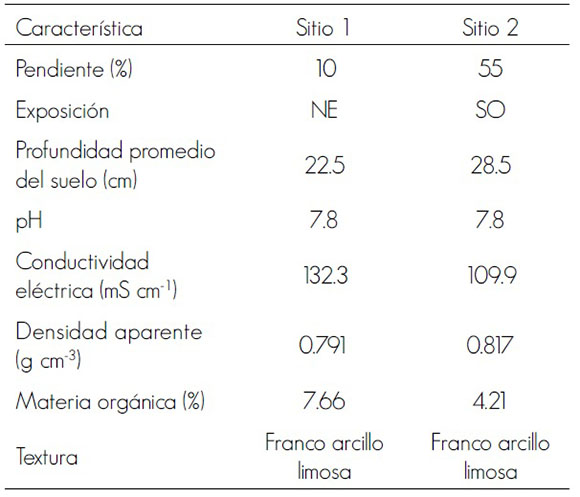 La supervivencia de una planta en un determinado sitio puede ser afectada por las propiedades físico-químicas del suelo como: humedad, temperatura, pH, conductividad eléctrica y contenido de nutrientes (Omary, 2011); aunadas a las condiciones topográficas (Chen y Klinka, 1998) y al método utilizado para establecer la plantación (Ortega et al., 2006). En este ensayo, los sitios presentaron propiedades edáficas similares (Cuadro 2); por lo tanto, las diferencias entre sitios de plantación es probable que se deban a las distintas pendientes y exposiciones.