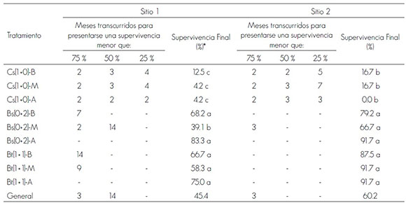 Tratamientos: Sistema de producción: Cs [1+0] = Siembra en charola; Bs [0+2] = Siembra en bolsa; Bt [1+1] = Siembra en charola y trasplante a bolsa; Preacondicionamiento: B = Nivel bajo; M = Nivel moderado; A = Nivel alto.*Letras diferentes indican diferencias estadísticas significativas mediante la prueba Log-Rank.