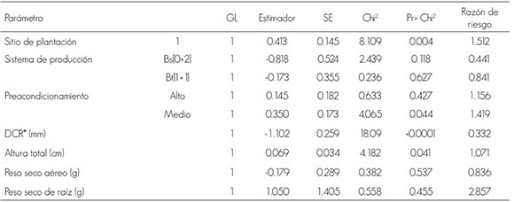 El análisis evidenció un efecto altamente significativo del diámetro al cuello de la raíz sobre la función de riesgo, con signo negativo en el estimador y una relación de riesgo de 0.332, lo que significa que el incremento de 1 mm en el diámetro de la planta reduce el riesgo de muerte hasta en 66.8 %; es decir, 100(1 -e-1.102), siempre y cuando se mantengan constantes las otras variables.