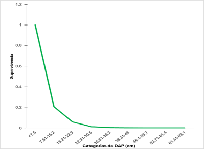 Cabe destacar que para un mejor manejo de la información se modificaron las categorías de tamaño usadas en las tablas de vida, ya que a partir del intervalo dimétrico 22.91-30.6 cm no se encontraron individuos.