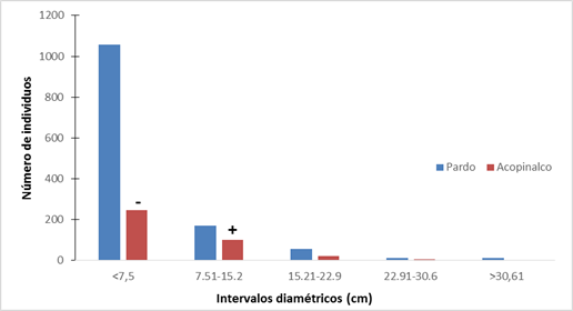 En el estudio realizado en EP y RAP, la estructura de tamaño difiere entre los sitios de muestreo, lo cual coincide con lo documentado en la literatura (Otto et al., 2005; Ayerde y López, 2006; Pérez et al., 2007). En RAP hubo menos individuos con DAP < a 7.5 cm de los que se esperaban, y más en la categoría 2 (7.51-15.2 cm). Sin embargo, los datos son similares a los de Otto et al. (2005), autores que consignan una mayor densidad de los individuos con menor DAP y altura.