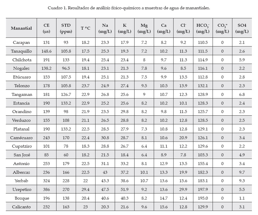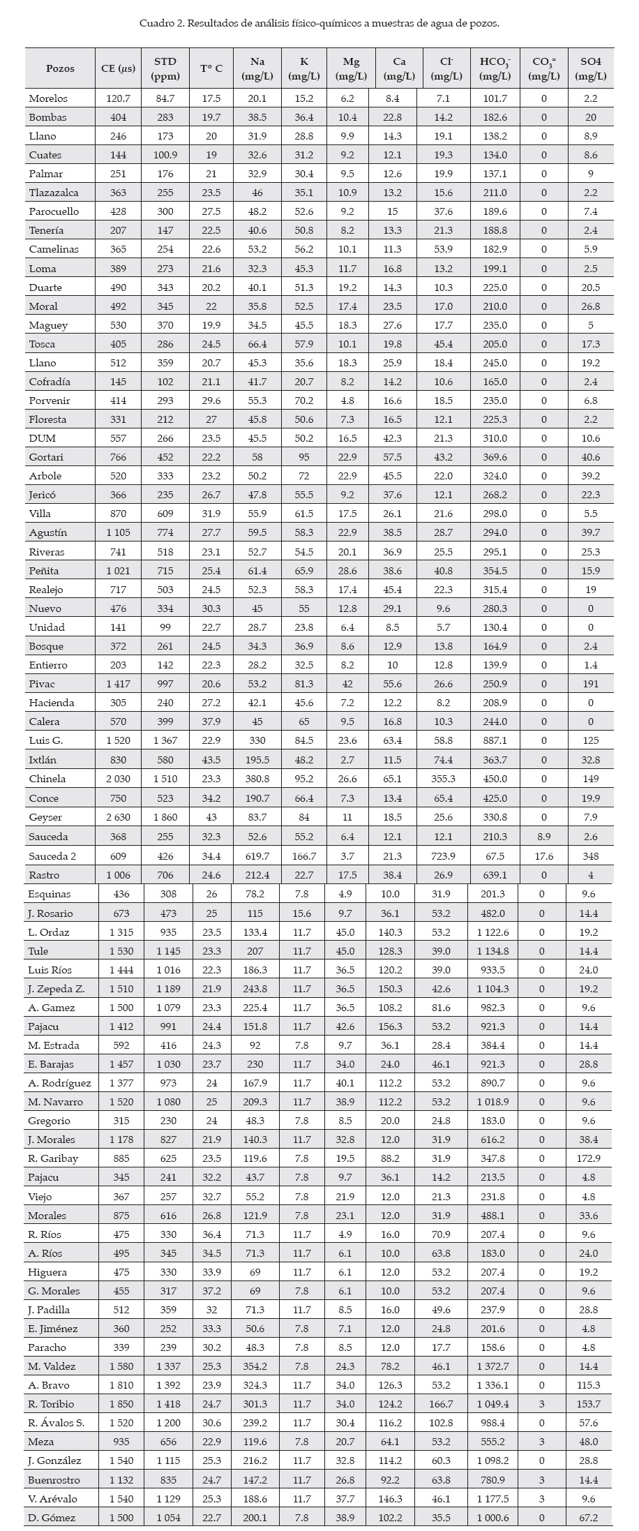 Los resultados de los análisis químicos realizados en manantiales y pozos se muestran en el cuadro 1 y 2, respectivamente.