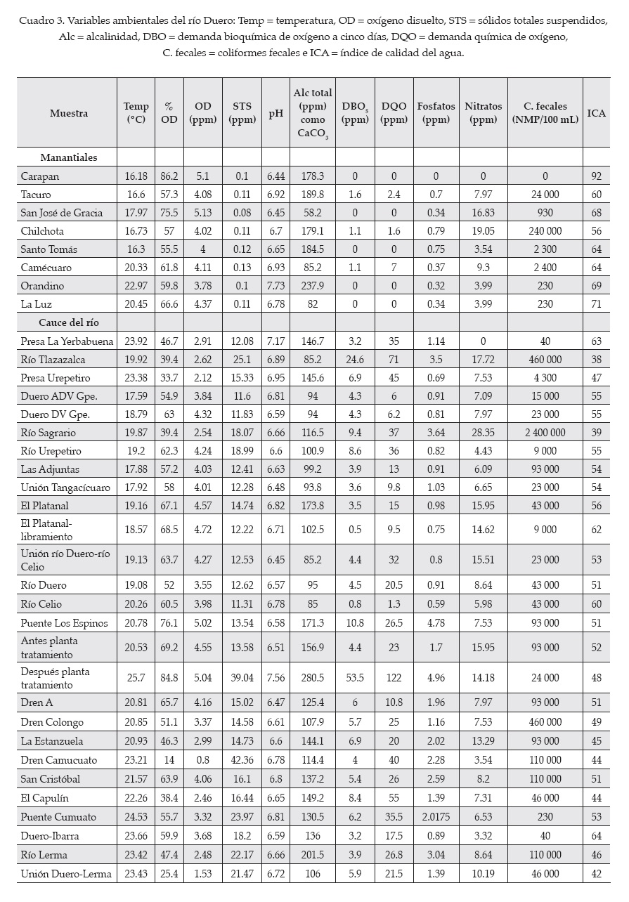 Análisis de la calidad del agua superficial. Se muestrearon 35 sitios en el río Duero, incluyendo el cauce principal, afluentes secundarios y manantiales. Dentro de las variables ambientales se midieron la temperatura (ºC), pH, oxígeno disuelto (ppm), % de saturación de oxígeno y nitratos (ppm) por medio de un multisensor (Hydrolab DataSonde 4X). Además, se recolectaron 2.5 L de muestra en el primer metro de profundidad para determinar la alcalinidad, demanda bioquímica de oxígeno (DBO5; en ppm), demanda química de oxígeno (DQO; en ppm), sólidos totales suspendidos (ppm) y fosfatos (APHA, 1998). Por último, se estimaron las bacterias coliformes fecales, mediante lo establecido en la NOM-112-SSA1-1994, y según Vanderzant y Spittstoesser (1992), empleando la técnica del número más probable (NMP).