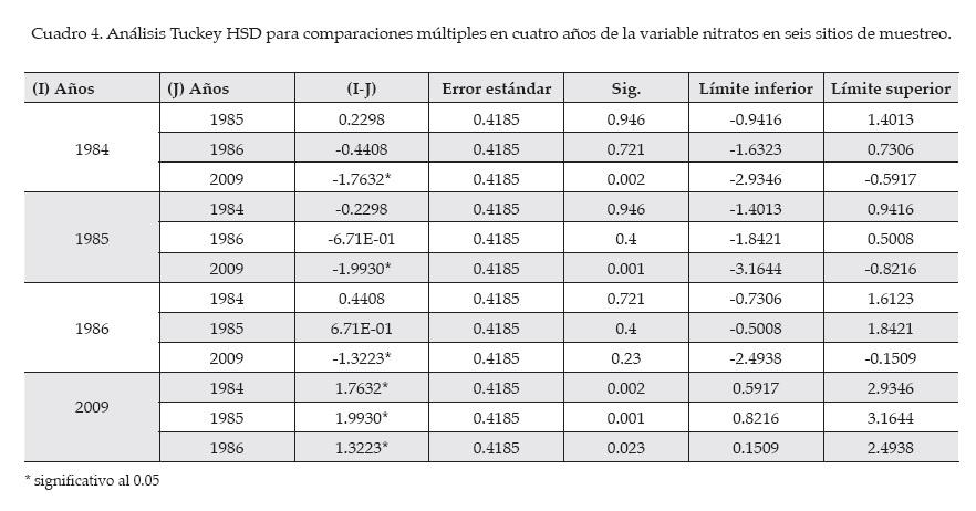 Por su parte, los nutrientes también aumentaron al comparar cuatro años. Destaca en particular que la diferencia entre los años se da principalmente entre los tres primeros, que fueron monitoreados de manera seguida en la década de 1980 y el valor obtenido en el 2009, indicando una diferencia estadística importante (F = 15.73, p = 0.0001) (cuadro 4).