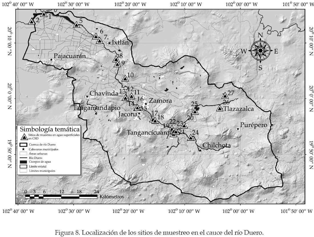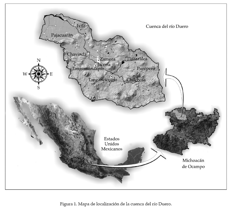 Área de estudio. La cuenca del río Duero se ubica al noroeste del estado de Michoacán, en las coordenadas 19° 40' y 20° 15' latitud norte, y 101° 45' y 102° 45' longitud oeste. Pertenece a la Jurisdicción Administrativa núm. VIII Lerma-Santiago-Pacífico, dentro de la Región Hidrológica núm. 12 Lerma-Santiago, específicamente en la denominada Subregión Hidrológica Bajo Lerma. Tiene una superficie de aportación de 2 531.3 km2, con un escurrimiento promedio anual de 250 millones de metros cúbicos. Tiene forma alongada y corre en dirección sureste-noroeste, cruzando cuatro microcuencas: la cañada de los Once Pueblos, los valles de Guadalupe y Zamora, para, finalmente llegar hasta la Ciénaga de Chapala (figura 1).
