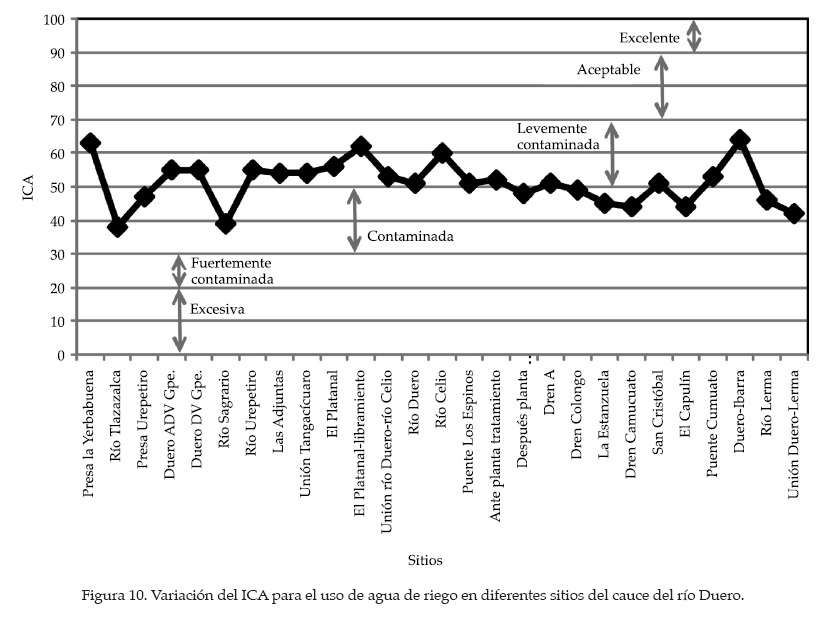 En lo que respecta al cauce del río, se implementó la interpretación del índice en el aspecto agrícola, quedando los diferentes sitios en la condición de levemente contaminado y contaminado. Destacan como los sitios de mayor contaminación el río Tlazazalca y río El Sagrario en Tangancícuaro, este último recibiendo las descargas domésticas de la capital municipal y de actividades agropecuarias, lo que degrada su calidad del agua de manera importante. Otros lugares con valores bajos del ICA son la presa Urepetiro, La Estanzuela, dren Camucuato y El Capulín (figura 10).
